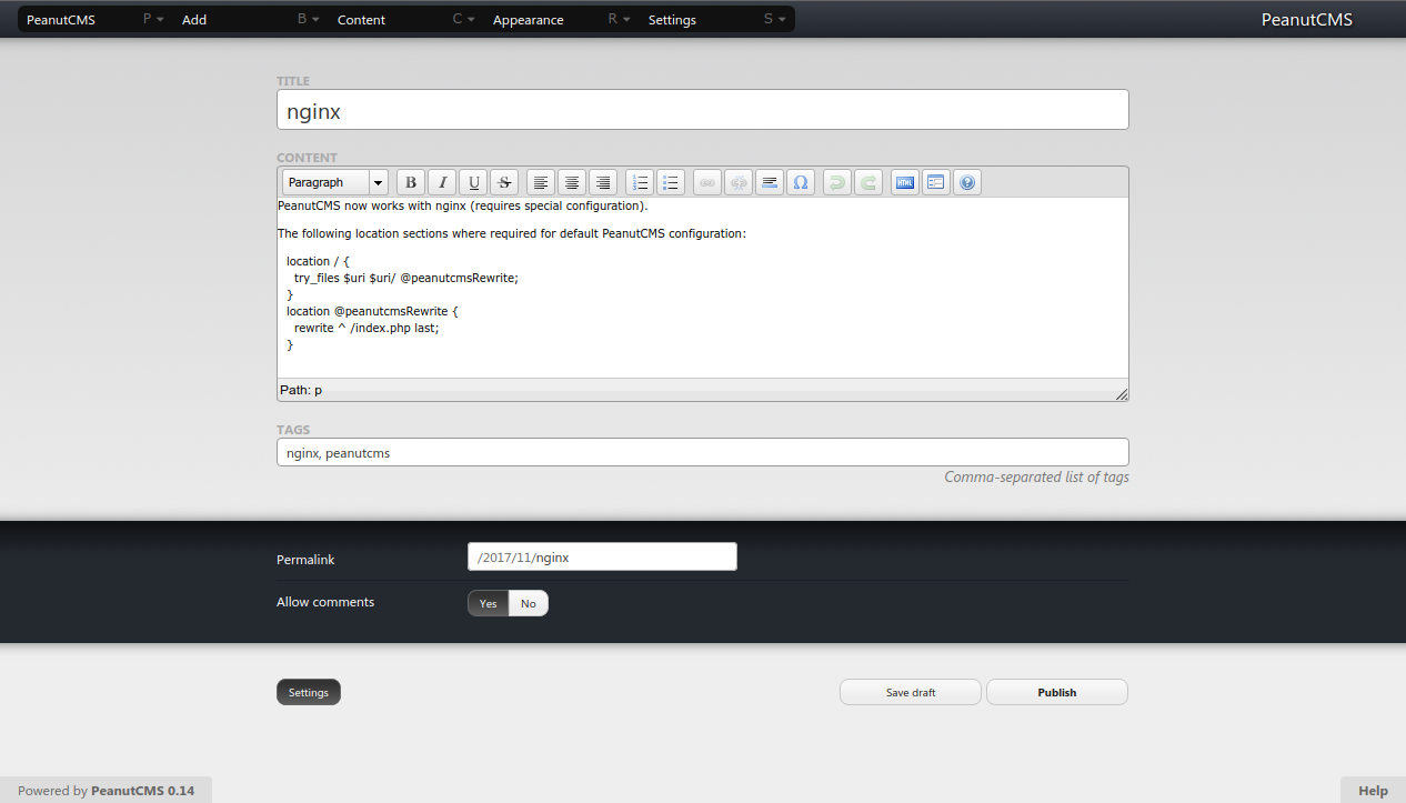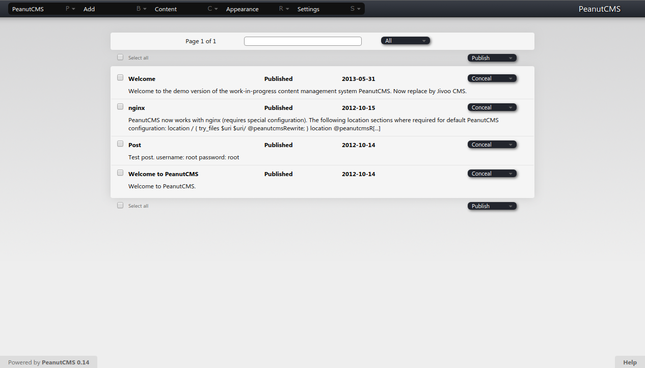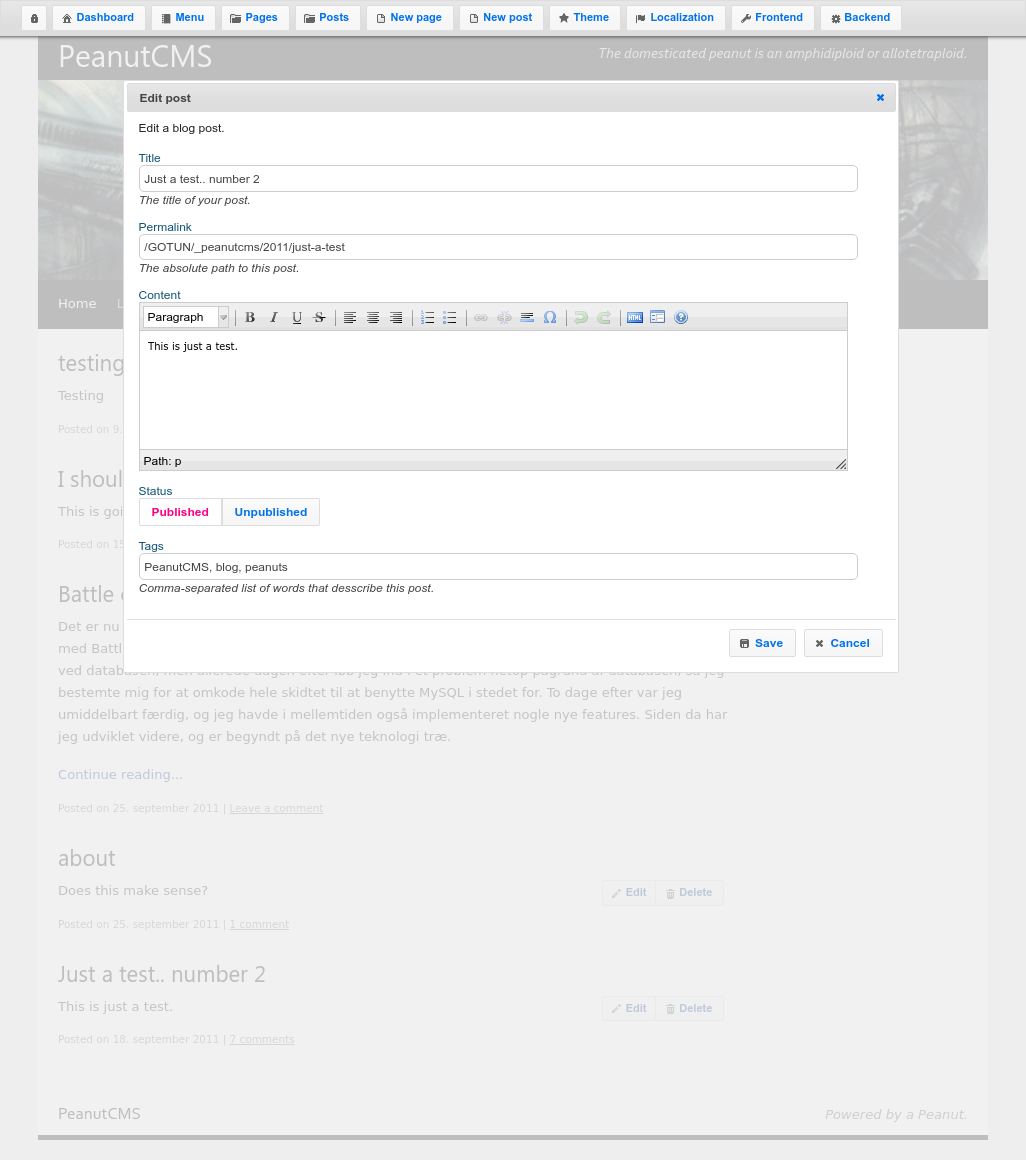 The original PeanutCMS was created in a week or so at the end of August 2011. Unfortunately I wasn't using version control at the time (first commit is from the end of January 2012) so I'm not entirely sure about the details of the early history. However, I do know that the GUI was originally implemented as a page overlay styled using jQuery UI, as displayed in the following screenshots: